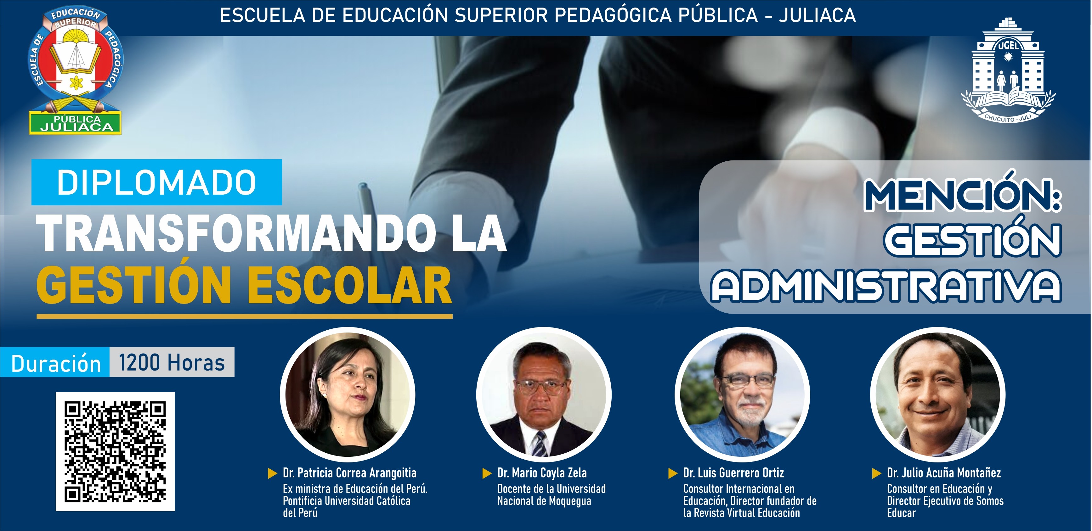 Diplomado Transformando la Gestión Escolar, se brindará las menciones en Gestión Institucional, Gestión Curricular y Gestión Administrativa. Certificación por 1200 Horas Académicas.